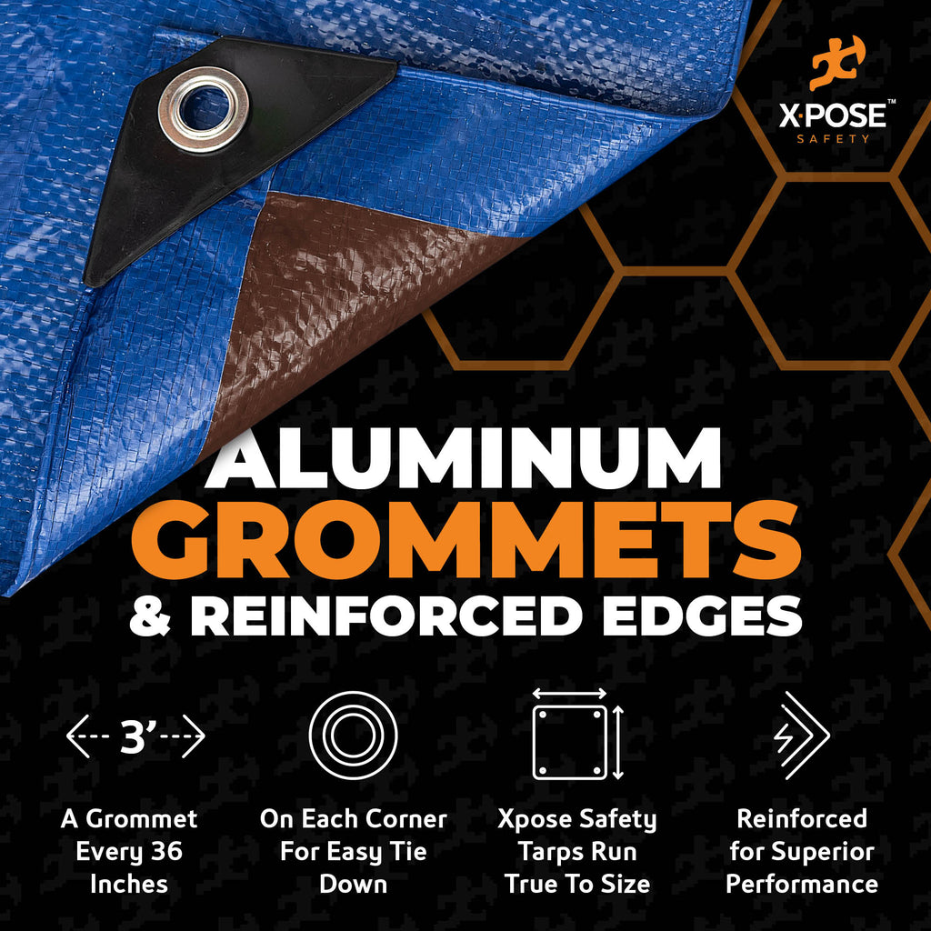 Xpose Safety tarps are made with the highest quality polyethylene, which is a form of plastic that is heavy duty. It is lightweight yet durable simultaneously which is an excellent quality - 7 mil thickness means it is crafted to be durable. Works amazingly well in the outdoors - Covers Cars, Boats, Motorcycles, Roofs, Lawns, Barbecue Grills, Benches, and More! Keep your belongings safe from harsh weather conditions when heavy rain and blizzards come around. grommets on the edges every 36 inches so you can easily tie it down on a surface.
